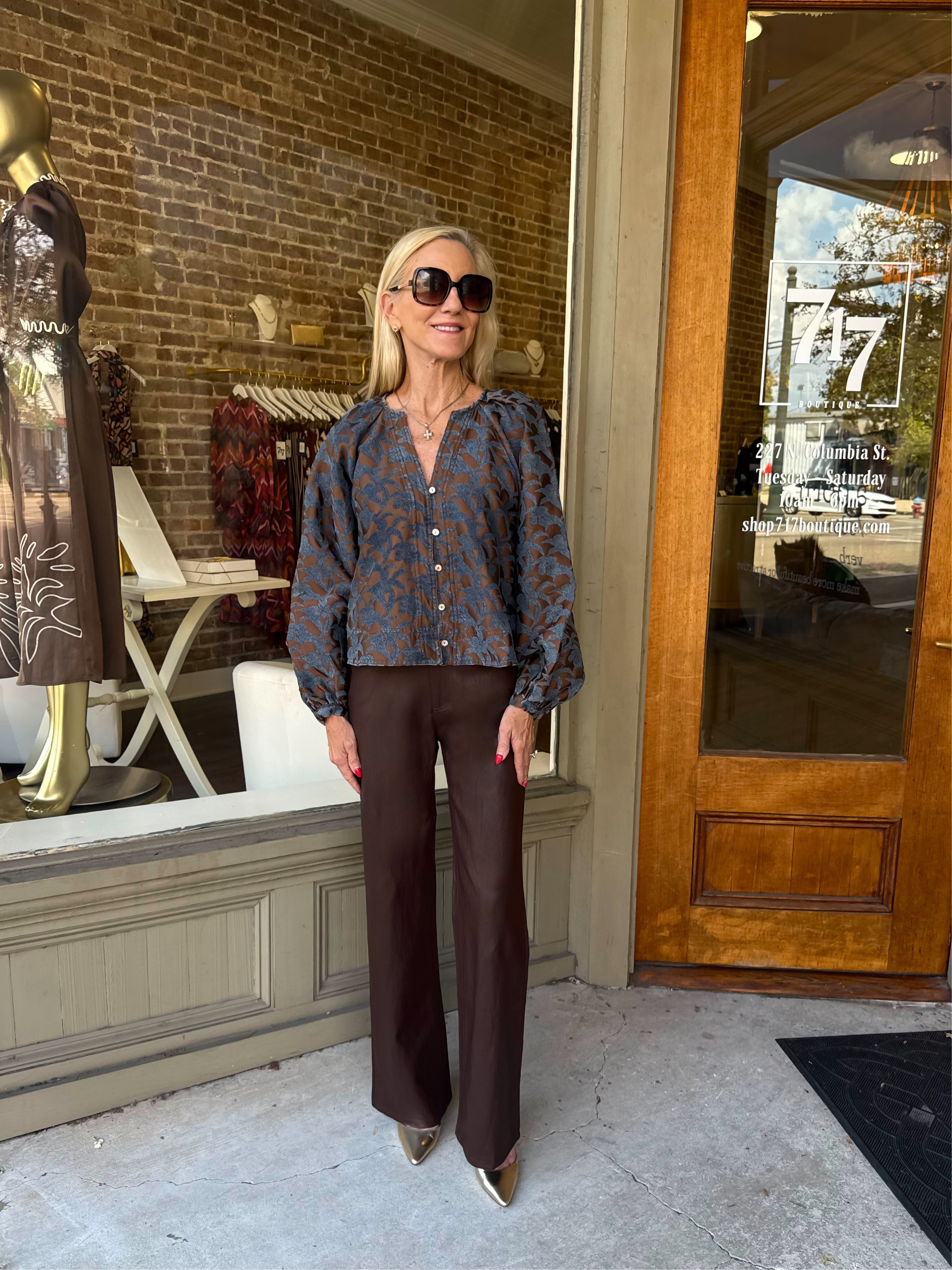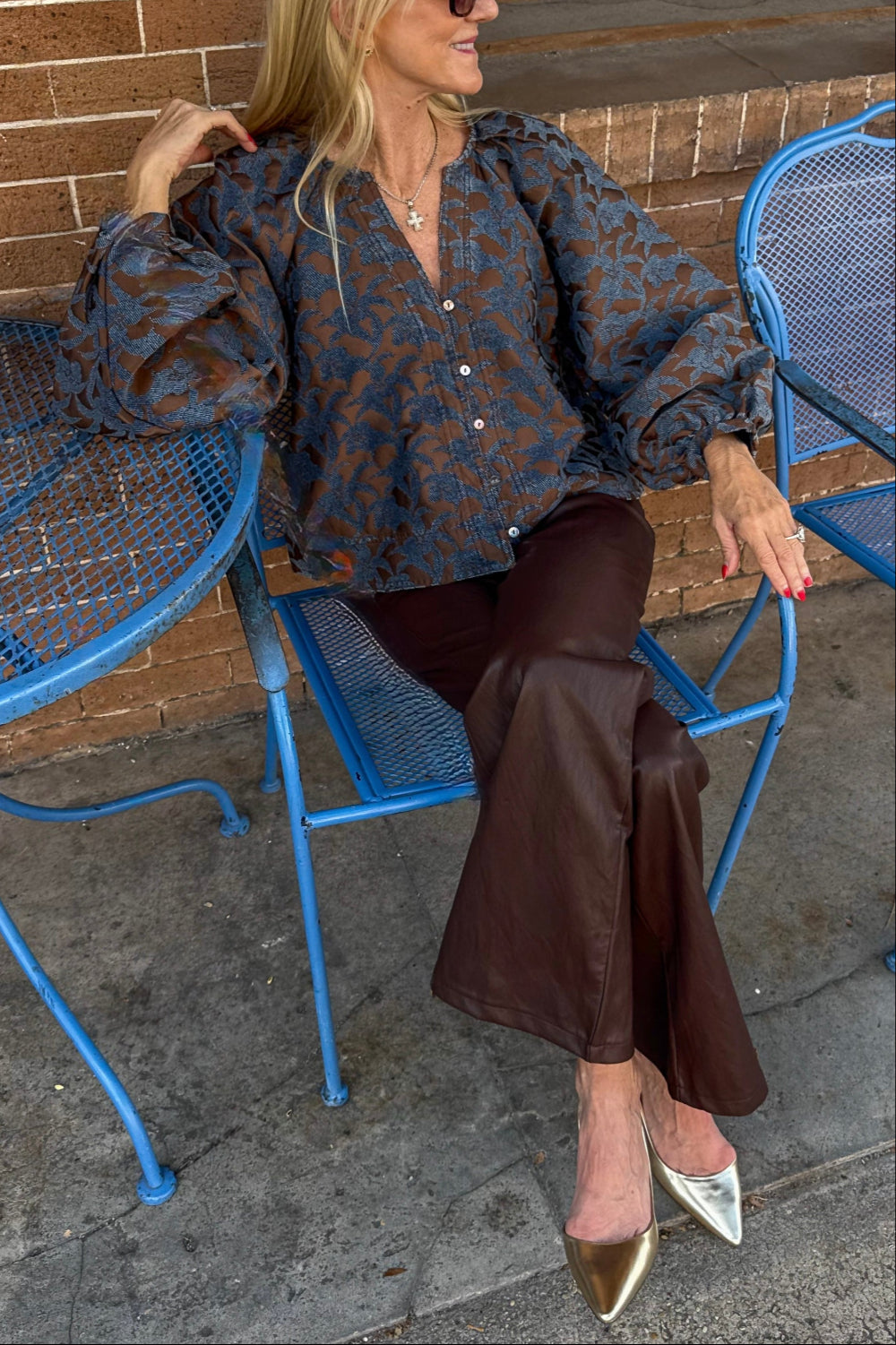Beautiful blue and brown printed blouse featuring blouson sleeves and button front closure. Styled with our new faux leather trousers