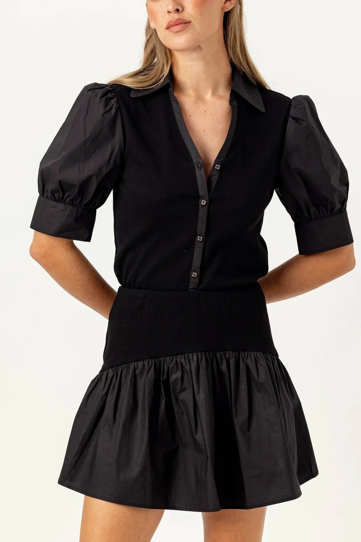 Mixed media ribbed knit body featuring cotton poplin puff sleeves. Pair with the matching Marie Skirt to complete the look