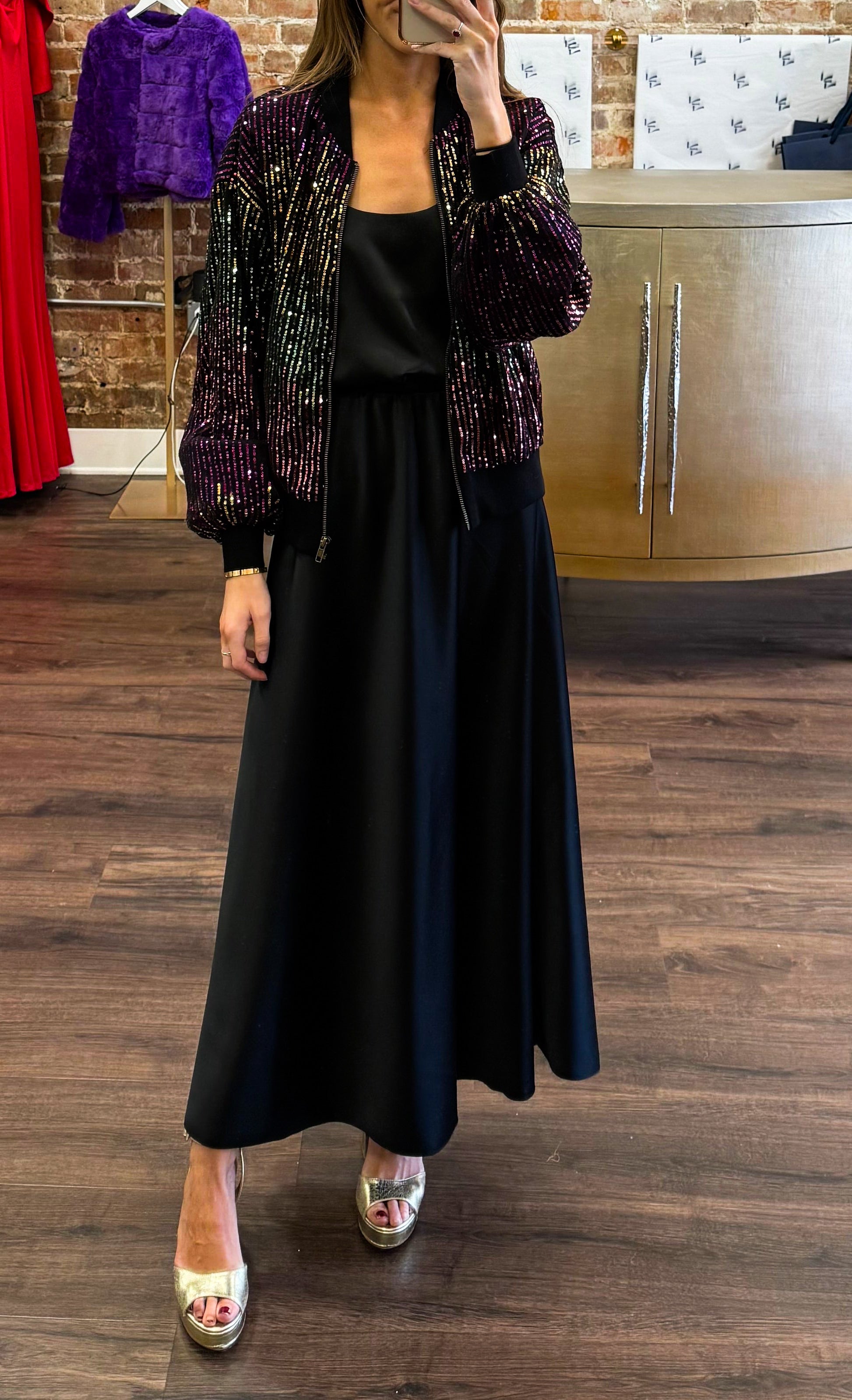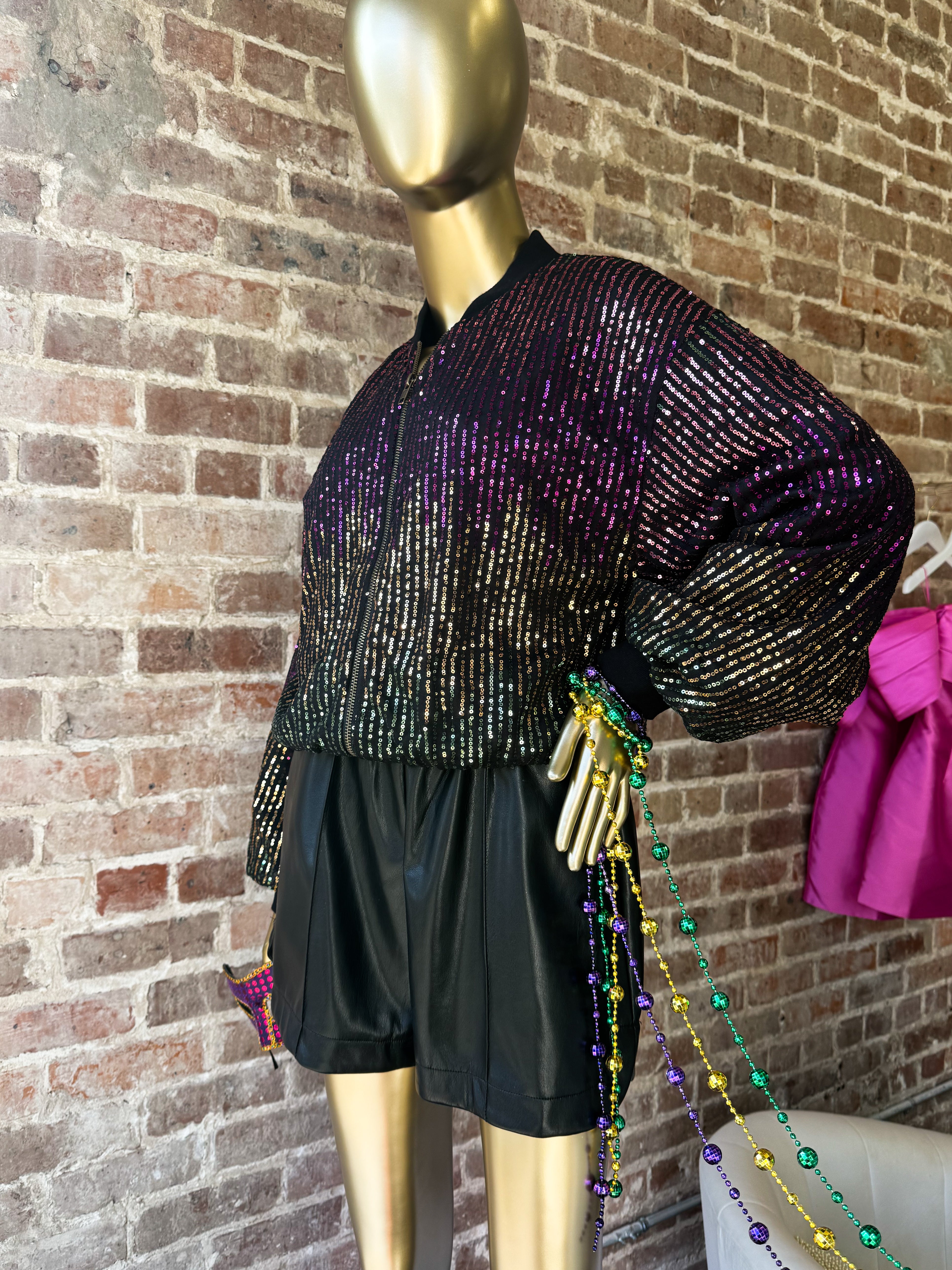 sequin bomber jacket featuring front zipper closure and ribbed waist band