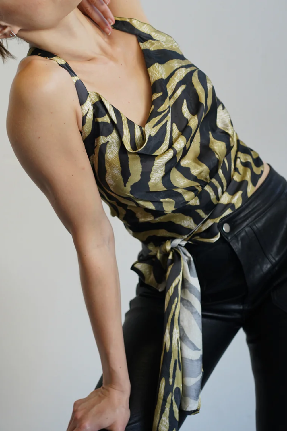 Cowl neck tiger print tank featuring adjustable criss-cross back