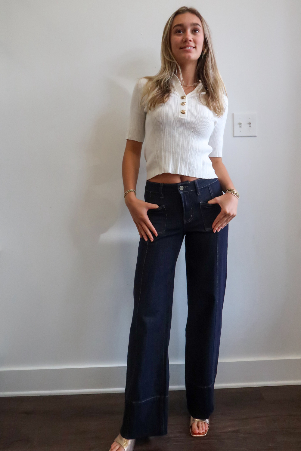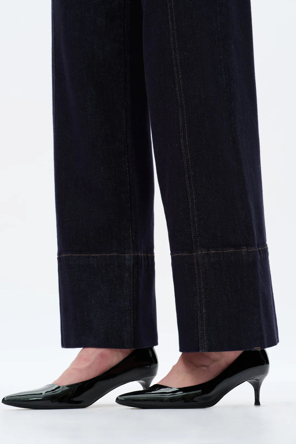 Mid-rise loose wide-leg denim features front patch pocket and faux cuff detailing