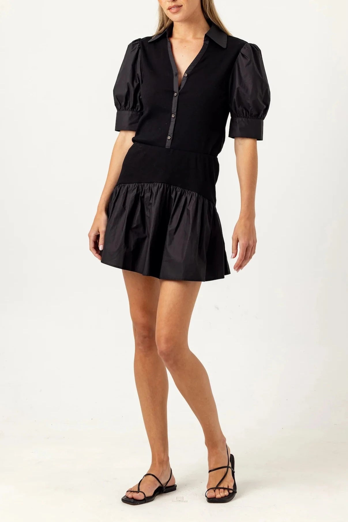 Mixed media cotton poplin mini skirt featuring a ribbed waistband that creates a slimming and flattering effect through the waist. Completely the look with the Hale shirt
