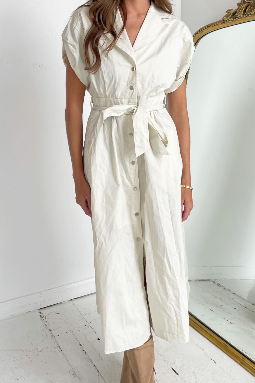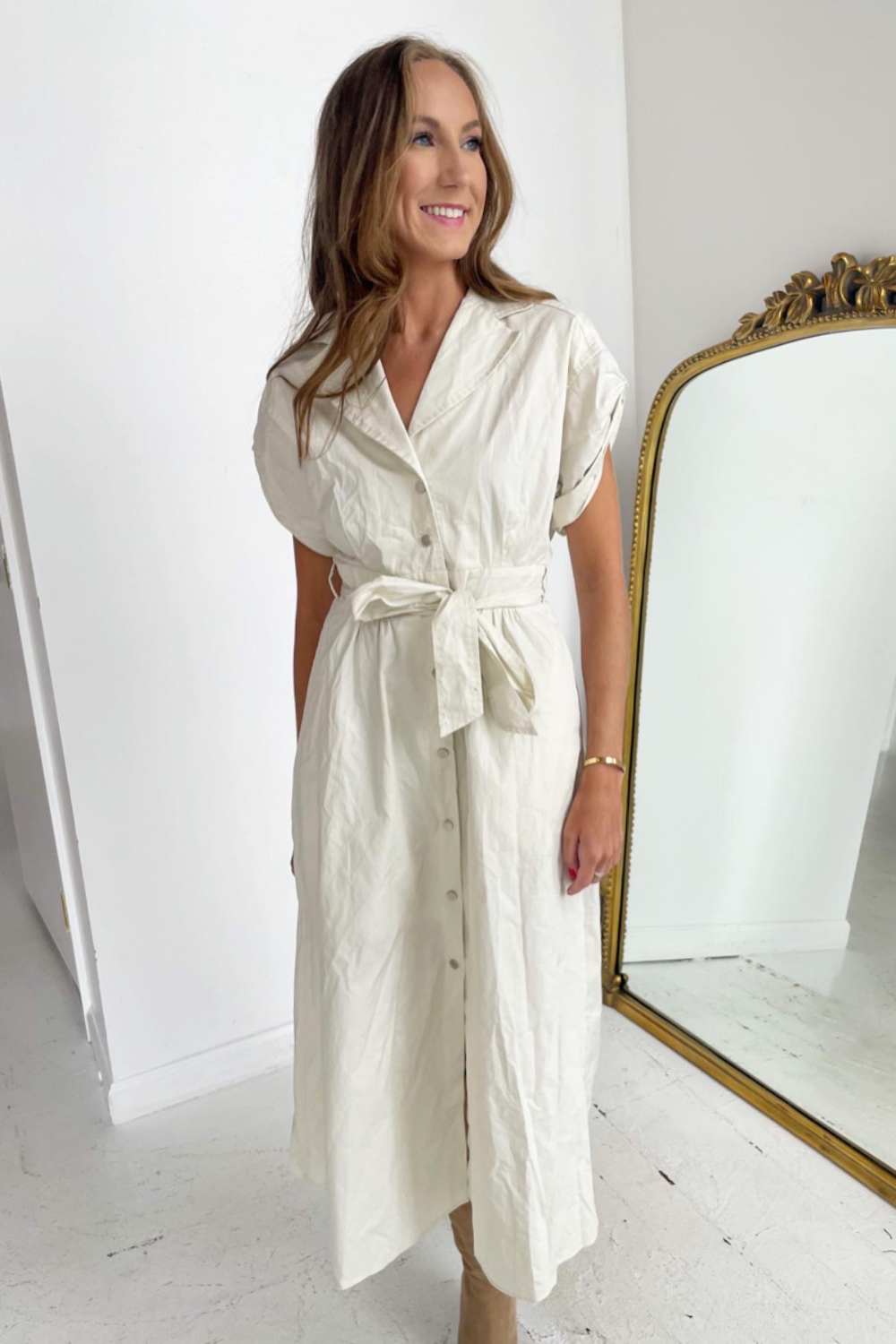 Poplin utility midi dress featuring button-up front and tie-waist closure