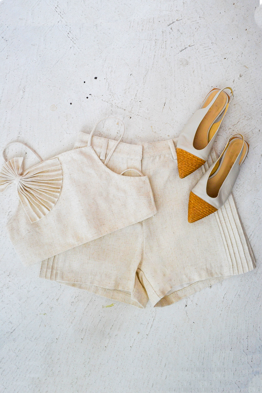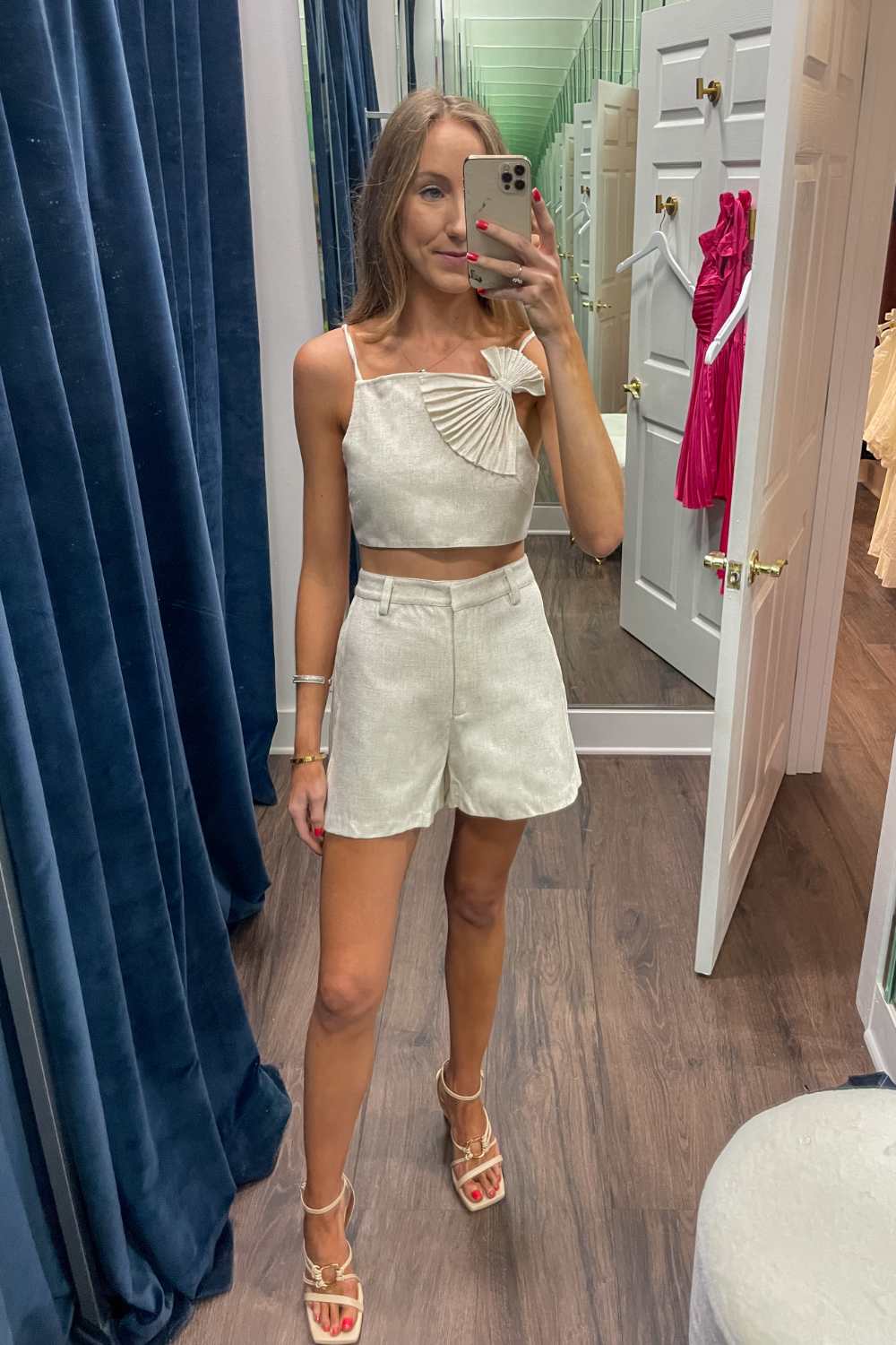tan textured crop top featuring shoulder and cut-out back detailing. Pair with the matching Fara High Waisted Shorts to complete the look!