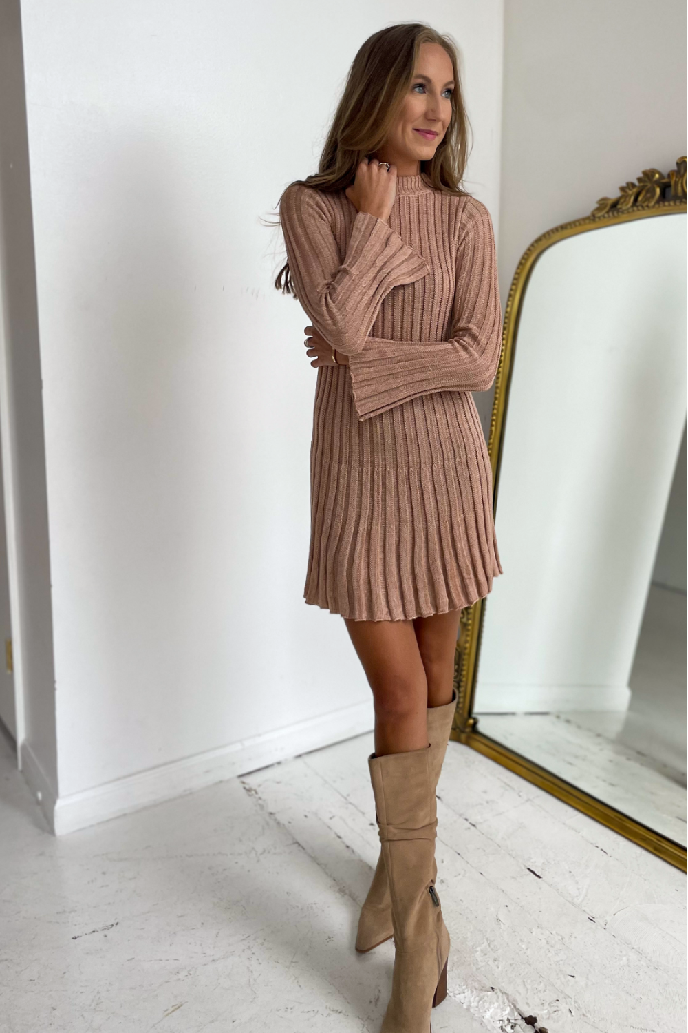 fitted metallic knit mini dress featuring flared sleeves and a fit & flare silhouette. Dress it up or dress it down- this knit mini is the perfect mini to transition to fall in!