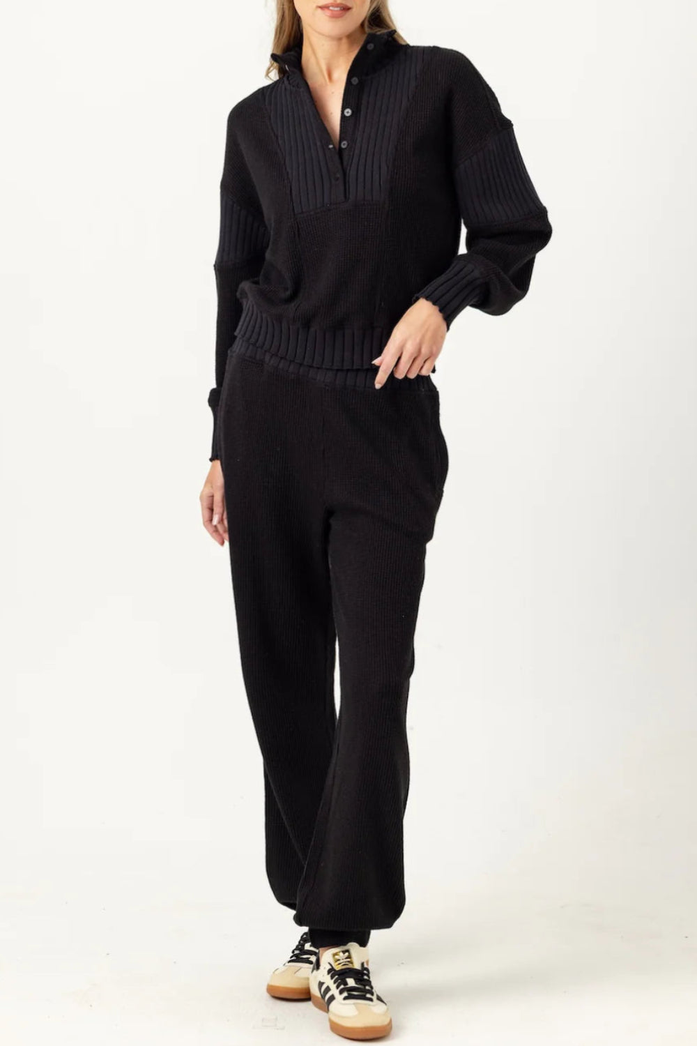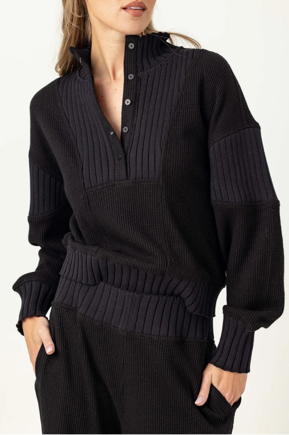 black knit pullover featuring a relaxed fit and mock neckline. complete the look with the matching piper jogger!