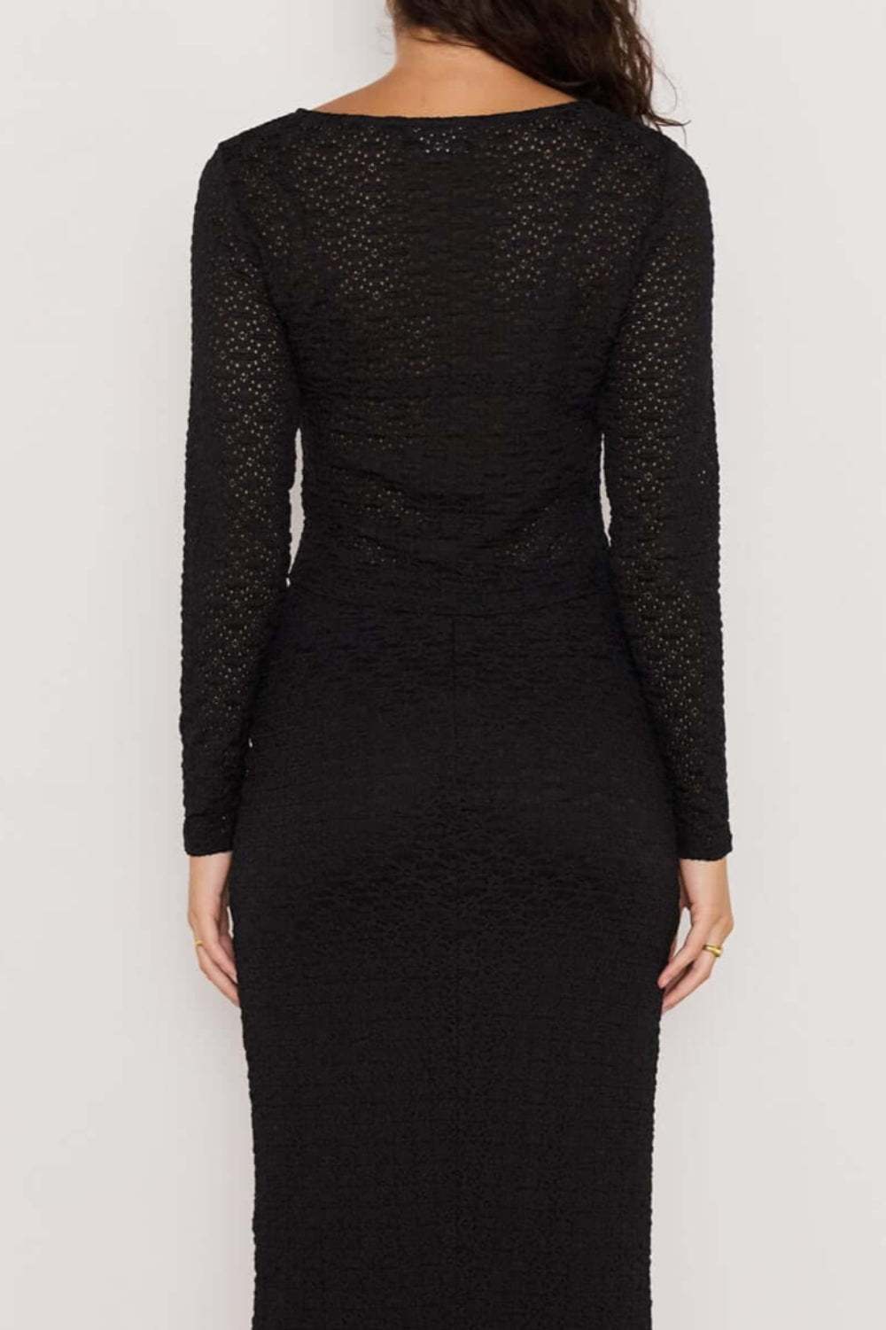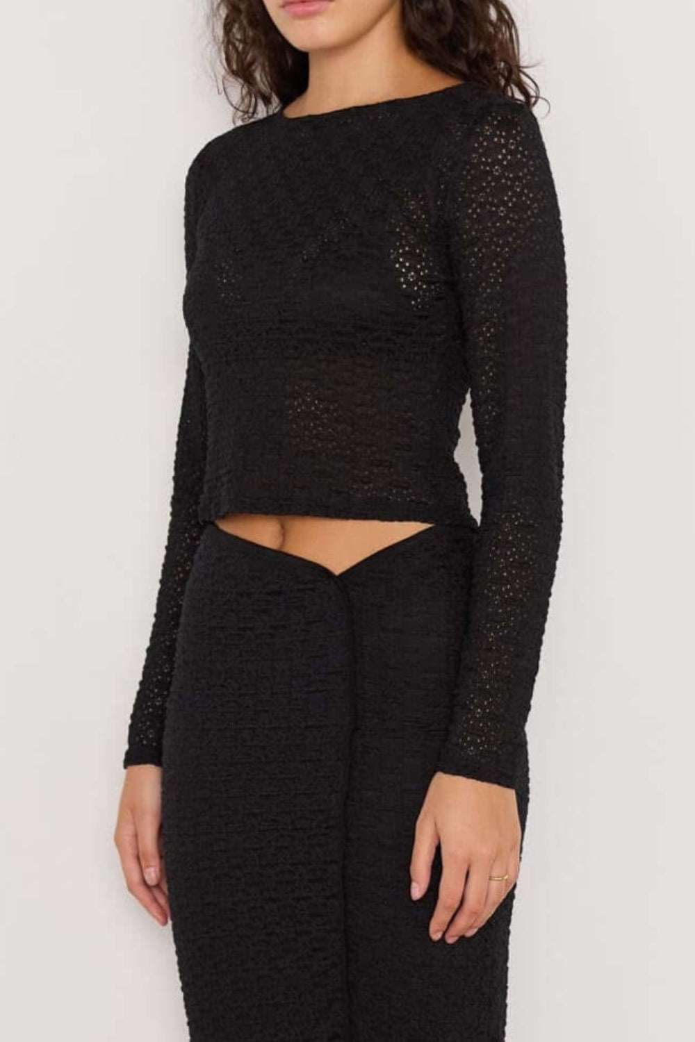 Sheer stretch lace fabrication for comfort and contour Long sleeves and high boat neckline